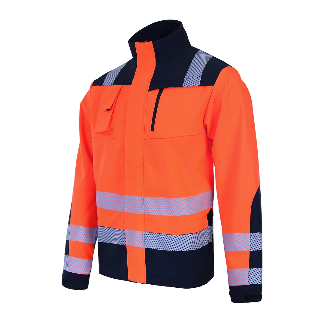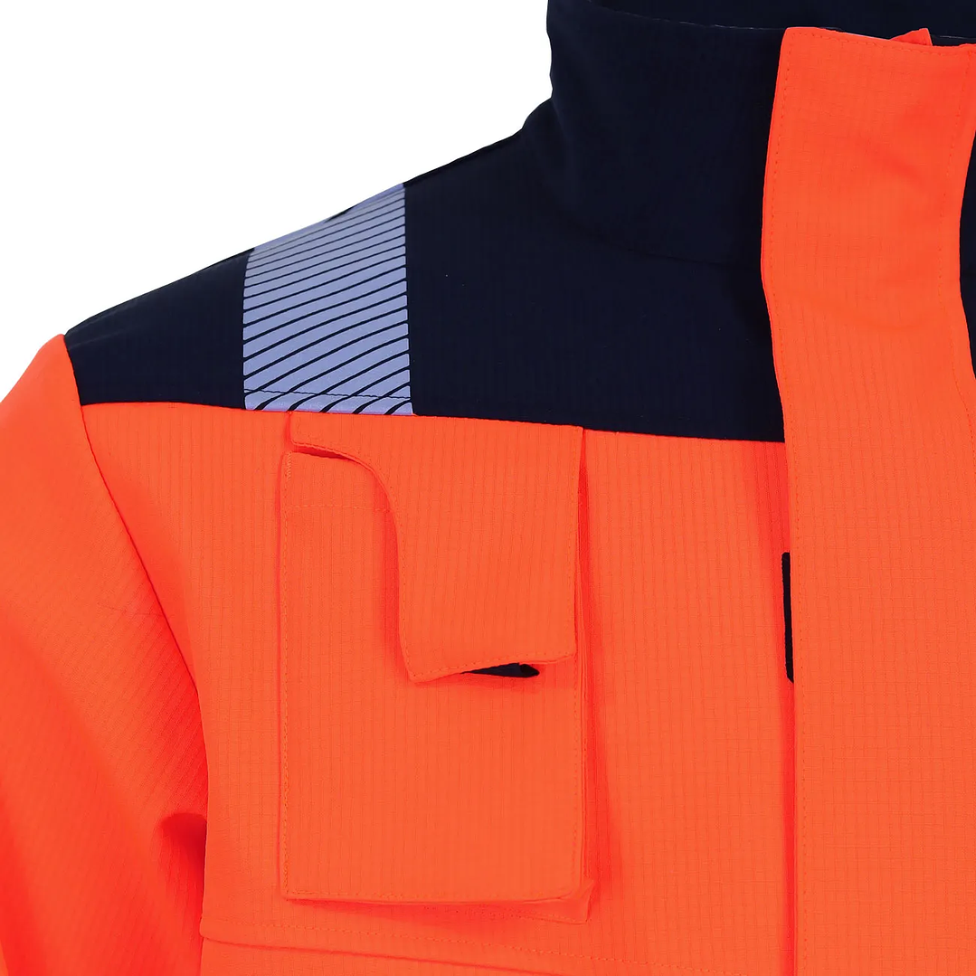 Destaca por sus estampados reflectantes tipo zebra de 2” en brazos, espalda y hombros, asegurando visibilidad en entornos de trabajo. En la espalda, presenta un diseño en disposición X que mejora la visibilidad general. Además, cuenta con puños ajustables con velcro y un cuello alto que proporciona mayor protección contra las inclemencias del tiempo.