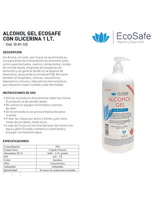 Alcohol Gel Ecosafe con Glicerina 1 Lt.