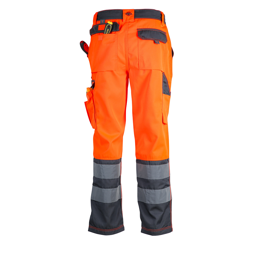 Fabricado en resistente tela de gabardina compuesta por 80% poliéster y 20% algodón, con un peso de 240 gramos, este pantalón es ligero pero fuerte, ideal para el trabajo en exteriores. Disponible en atractivo color amarillo/gris oscuro y naranja/gris oscuro, proporciona no solo funcionalidad, sino también estilo.