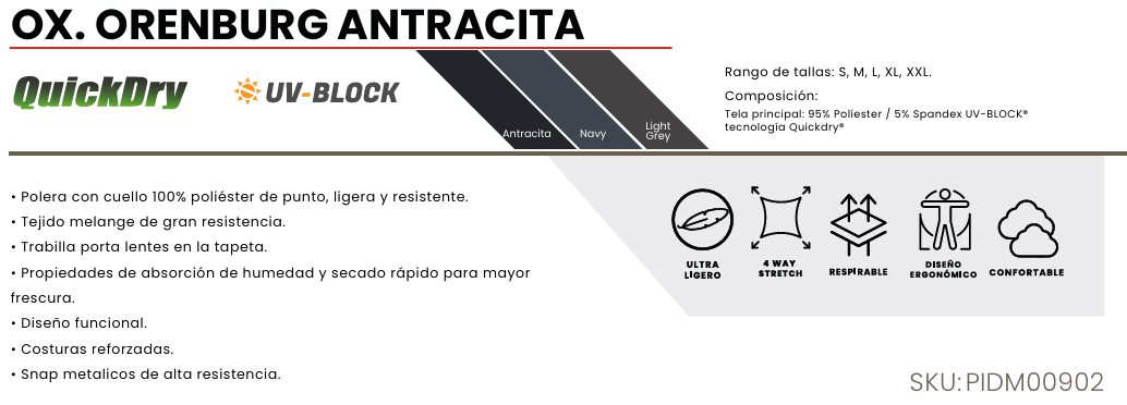 La Polera Técnica Orenburg Hombre OXWEAR está diseñada para acompañarte en actividades exigentes dentro o fuera de la ciudad. Confeccionada en tejido de punto melange 95% poliéster y 5% spandex UV-BLOCK®, ofrece ligereza, elasticidad y durabilidad para un rendimiento confiable todo el día.
