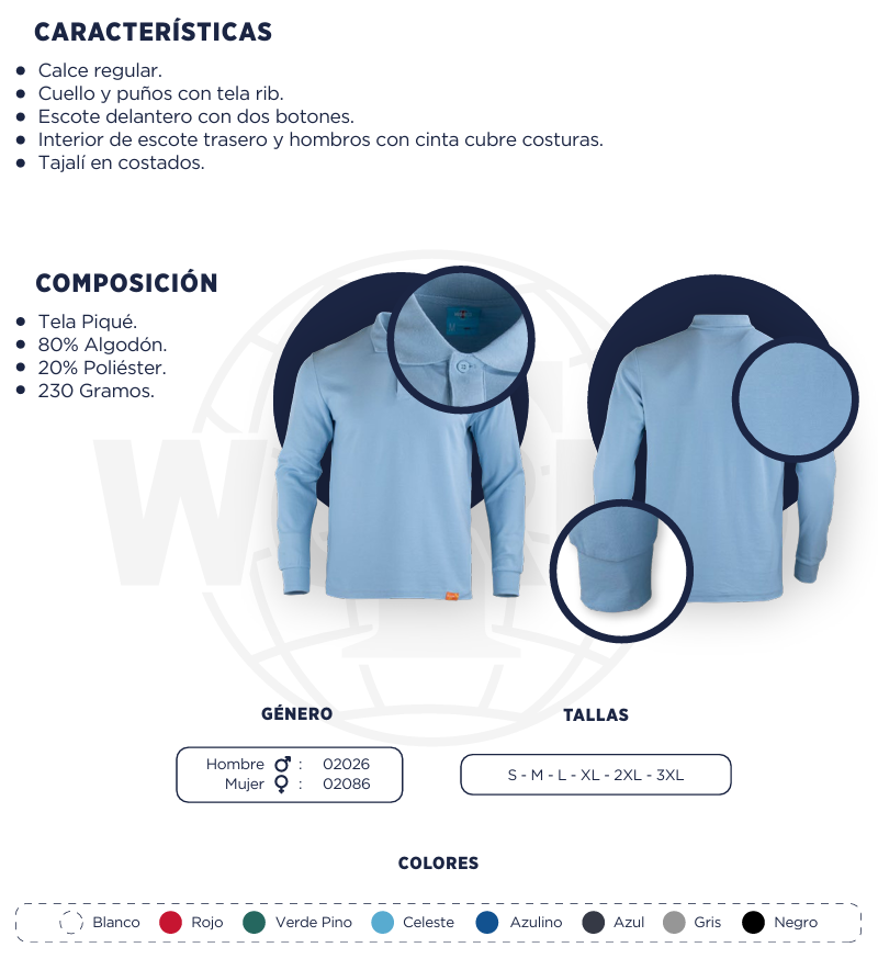 - Polera Polo Pique Manga Larga Hombre Super Premium 80/20 UV